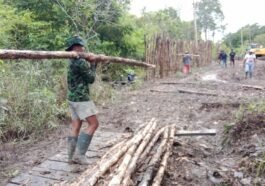 Barito Selatan – Guna mempercepat proses pembukaan jalan, satu per satu anggota Satgas TMMD Ke-124 Kodim 1012/Buntok terlihat memanggul kayu …