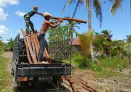 Barito Selatan – Proses pemasangan kayu penyangga di lokasi pembangunan jalan TMMD Ke-124 Kodim 1012/Buntok terus berlangsung dengan penuh semangat …