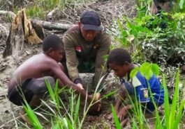 Personel Satuan Tugas (Satgas) TNI Manunggal Membangun Desa (TMMD) ke-124 Kodim 1710/Mimika menunjukkan kepedulian terhadap pelestarian lingkungan dengan mengajak anak-anak …