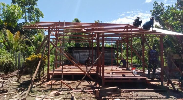 Pekerjaan lanjutan pembangunan RTLH TMMD ke-125 di Kampung Manunggal Jaya, Distrik Makimi, memasuki tahap pemasangan atap. Rabu (30/07/2025), Satgas TMMD mulai menutup kerangka atap yang telah dipasang dengan lembaran seng berkualitas.