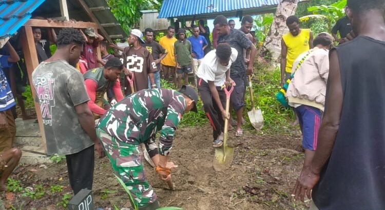 Timika ~ Personel Satgas TMMD ke 124 Kodim 1710/Mimika dpp. Serka Nurkholis bersama dengan warga setempat melaksanakan penggalian kuburan untuk tempat pemakaman Istri Kepala Kampung Pigapu yang meninggal Sabtu Dini hari kemaren berlokasi di TPU Kp. Pigapu Distrik Iwaka, Kab. Mimika, Minggu (25/05/2025).