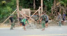 KENDARI – Semangat kebersamaan mewarnai proses pemasangan rangka atap MCK oleh Satgas TMMD ke-127 Kodim 1417/Kendari di Kelurahan Sambuli, Selasa (3/3).