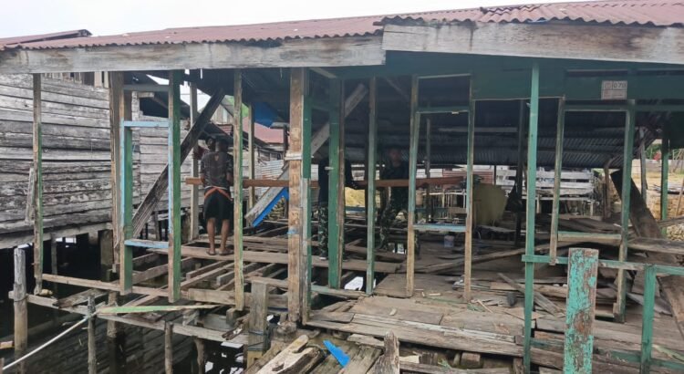 Personel Satgas bersama masyarakat setempat bekerja sama membongkar bagian bangunan lama, lalu membangun kembali dengan material yang lebih kuat dan tahan lama.