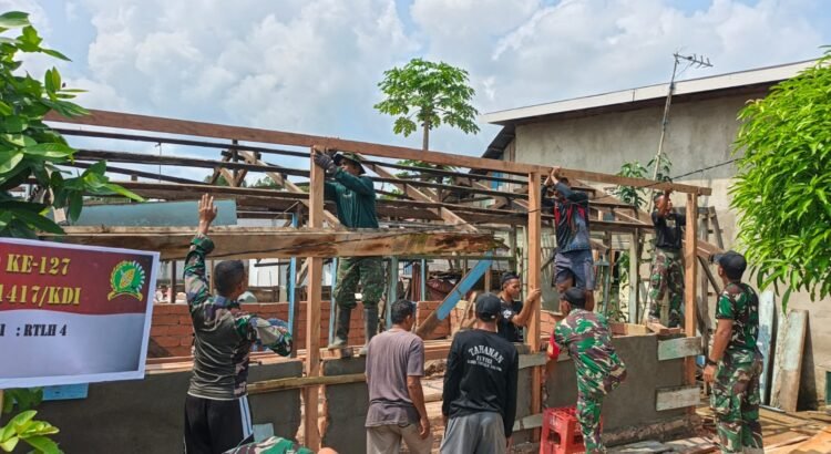 Dalam kegiatan tersebut, personel TNI bersama masyarakat bahu-membahu memasang rangka badan rumah sebagai bagian dari percepatan program bedah rumah bagi warga kurang mampu.