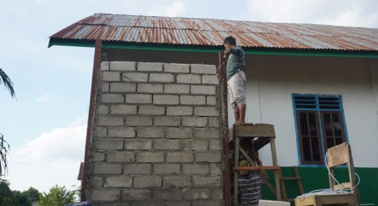 Tak hanya personel TNI, warga sekitar turut ambil bagian membantu proses pembangunan. Tangga kayu yang digunakan prajurit juga dimanfaatkan bersama saat mengerjakan bagian dinding dan pengecatan bangunan.