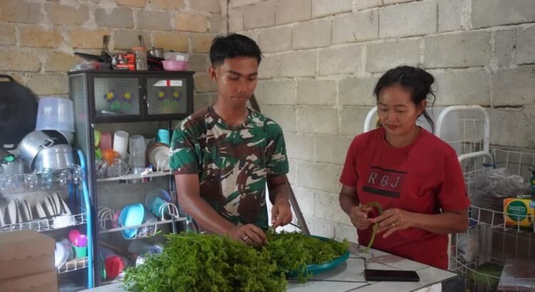 Anggota Satgas TMMD pun tidak canggung, seperti yang dilakukan Pratu Suryadi, ia ikut membantu lbu Eni tuan rumah yang sedang memasak sayur bayam atau menggoreng ikan sebagai lauk makan siang. Suasana keakraban pun nampak jelas, serasa seperti keluarga.
