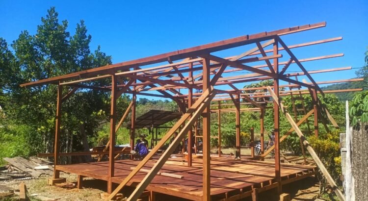 Kerangka rumah menjadi struktur utama yang menandai bentuk bangunan secara keseluruhan. Satgas TMMD bersama warga bekerja sama menyusun dan mengikat kayu dengan sistem penguatan agar tetap kokoh dan stabil dalam jangka panjang, terutama menghadapi kondisi cuaca Papua yang cukup ekstrem.