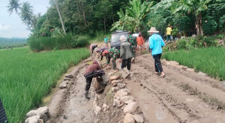 Pesawaran — Tahapan pelangsiran material menjadi salah satu pekerjaan penting dalam pelaksanaan TMMD ke-127 TA 2026 Kodim 0421/Lampung Selatan di Desa Tanjung Rejo, Kecamatan Way Khilau, Rabu (11/2/2026). Satgas TMMD bersama warga terus mendistribusikan batu belah dan pasir ke lokasi pembangunan talut dan rabat beton.