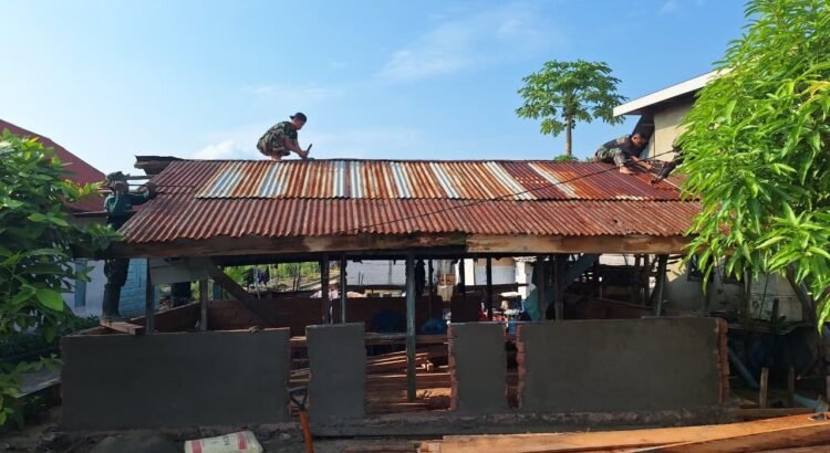 Diawali dengan pembongkaran atap seng yang telah usang, personel Satgas bersama warga setempat bekerja gotong royong memastikan setiap bagian rumah yang rusak segera diperbaiki.