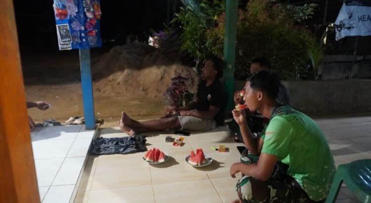 Usai melaksanakan pekerjaan sasaran fisik yang cukup menguras tenaga, para prajurit berkumpul dan bersantai di rumah warga. Suasana penuh keakraban terlihat jelas saat Satgas dan masyarakat berbincang santai sambil menikmati malam.