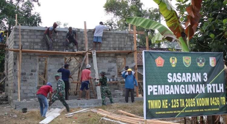 Tulang Bawang, 2 Agustus 2025 — Pembangunan Rumah Tidak Layak Huni (RTLH) dalam program TMMD ke-125 Kodim 0426/Tulang Bawang di Sasaran 3 Kampung Agung Dalam, Kecamatan Banjar Agung, terus mengalami kemajuan. Pada hari ini, pekerjaan difokuskan pada tahap pengecoran talang sebagai bagian dari penyempurnaan konstruksi atap.