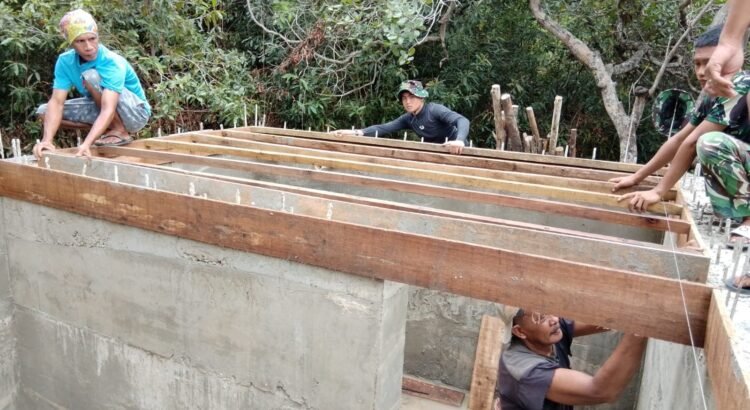 Dengan penuh ketelitian, prajurit dan warga menyusun rangka kayu di atas struktur beton sebagai persiapan pengecoran. Tahapan ini menjadi bagian penting untuk memastikan penutup bak kuat dan presisi.