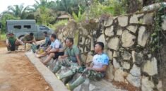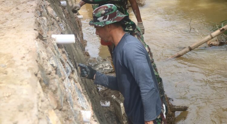 Anggota dari Kodim Kendari bersama warga setempat tampak kompak meratakan adonan semen pada susunan batu talud.