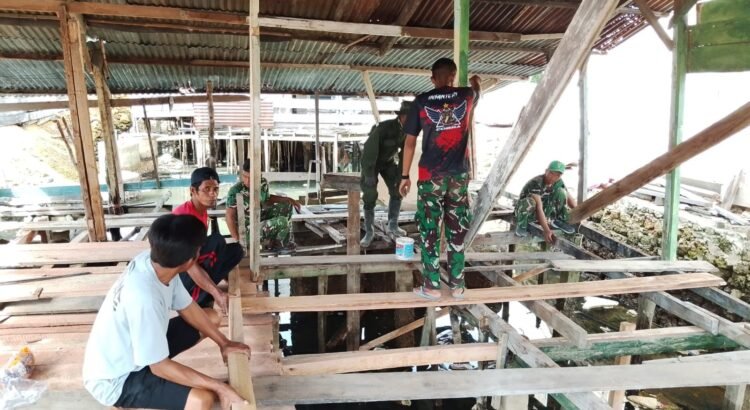 Personel Satgas bersama masyarakat setempat tampak bahu-membahu menyelesaikan setiap proses pekerjaan, mulai dari perbaikan struktur bangunan hingga tahap finishing.