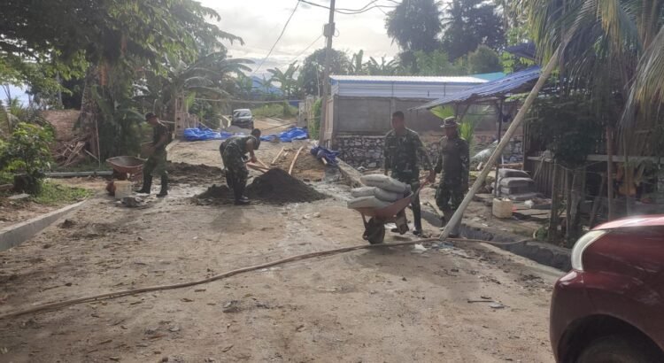 Sejumlah prajurit bersama warga setempat tampak kompak melangsir material semen dan pasir secara manual untuk mendukung proses plesteran dinding talud. Kegiatan ini dilakukan guna memastikan struktur bangunan memiliki daya tahan maksimal terhadap tekanan tanah dan cuaca.