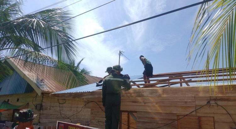 Personel Satgas bersama warga setempat bergotong royong melakukan pemasangan atap seng pada rumah yang sedang direhabilitasi. Pemasangan ini dilakukan dengan teliti agar struktur atap terpasang kuat dan rapi.