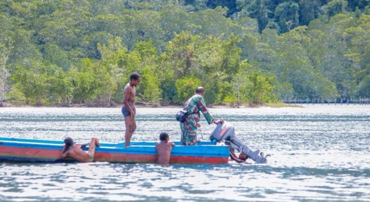 Kaimana – Satgas TMMD 127 Kodim 1804/Kaimana memperlihatkan momen mengharukan sekaligus heroik saat seorang anak asli Kampung Sisir membantu Babinsa dalam persiapan berlayar guna mengambil persediaan semen untuk pembangunan di Kampung Marsi, Kabupaten Kaimana, pada 01/03/2026.
