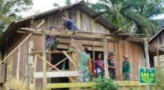 Personel TNI bersama warga tampak kompak menaikkan lembaran seng dan memasangnya ke rangka atap yang telah berdiri kokoh. Proses ini dilakukan dengan cermat untuk memastikan atap terpasang kuat dan rapi.