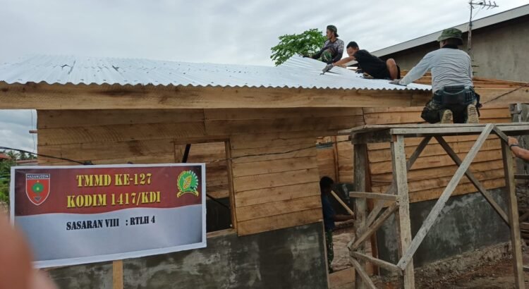 KENDARI – Memasuki tahap akhir konstruksi, Satgas TMMD ke-127 dari Kodim 1417/Kendari mulai melaksanakan pemasangan atap seng pada RTLH unit ke-4 di Kelurahan Petoaha, Rabu (4/3).
