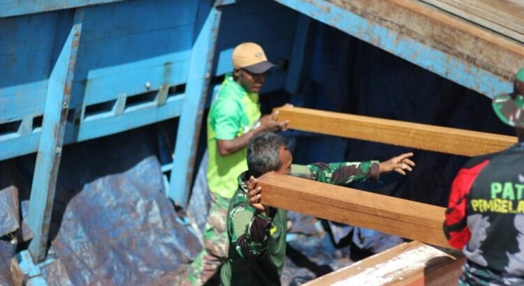 Kaimana – Upaya percepatan pembangunan infrastruktur terus dilakukan dalam program TMMD ke-127. Pada Kamis (12/02/2026), personel Satgas melaksanakan pemuatan kayu dari somel Solata menuju Pelabuhan Coa guna mendukung pembangunan di Kampung Sisir 2.