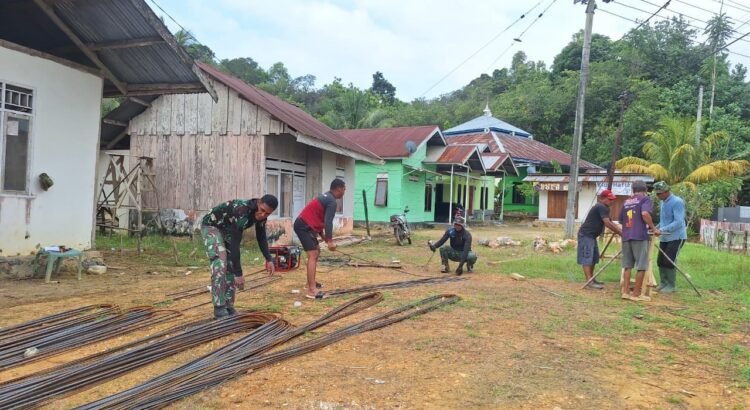 Saat proses pembengkokan besi tulangan berlangsung di Kelurahan Sambuli, personel TNI tidak hanya bekerja, tetapi juga memberikan penjelasan mengenai teknik dasar konstruksi kepada warga yang ikut membantu.