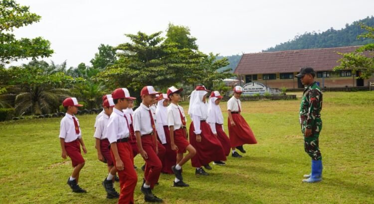 Kotawaringin Timur – Satuan Tugas TMMD Reguler ke-127 Kodim 1015/Sampit memberikan pelatihan Peraturan Baris Berbaris (PBB) kepada murid Sekolah Dasar di Desa Tri Buana, Kecamatan Telaga Antang, Kabupaten Kotawaringin Timur, Senin (02/03/2026).
