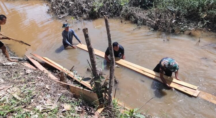 Barito Selatan – Satgas TMMD Kodim 1012/Buntok mengambil cara unik dan kreatif untuk mengangkut kayu menuju lokasi kegiatan TMMD dengan melewati sungai. Meskipun harus berbasah-basahan, kayu yang mengapung di atas air membantu meringankan beban saat pengangkutan.