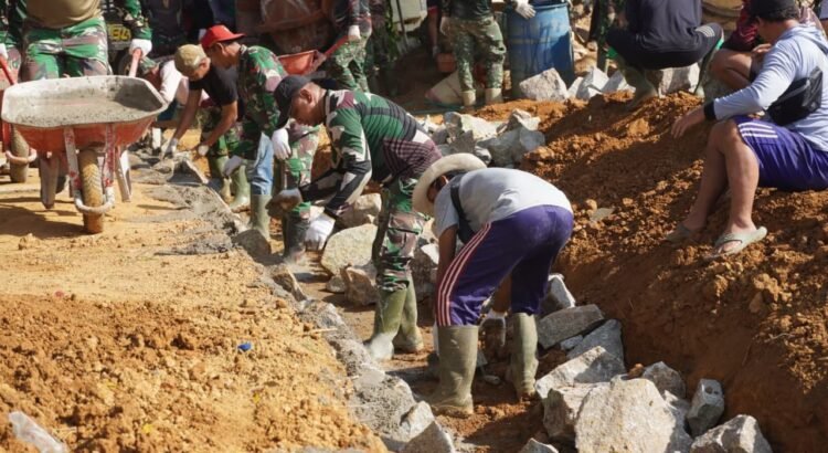 Kotawaringin Timur – Satgas TMMD Reguler ke-127 bersama masyarakat terus mempercepat pemasangan batu siring sebagai penahan tanah badan jalan, Sabtu (14/02/2026).