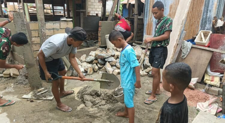 Di sela aktivitas pembangunan Rumah Tidak Layak Huni (RTLH), sejumlah anak tampak membantu melangsir material adukan semen dalam skala ringan. Kehadiran mereka menjadi pemandangan yang menghangatkan suasana lokasi pekerjaan.