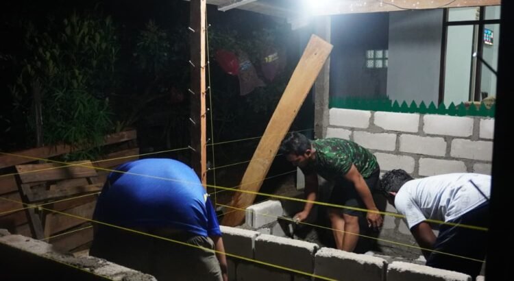 Kotawaringin Timur – Kebersamaan antara Satgas TMMD Reguler ke-127 dan masyarakat terlihat dalam pembangunan MCK dan tempat wudhu Mushola Mudalil Muttakin yang dilakukan hingga malam hari, Jumat malam (13/02/2026).