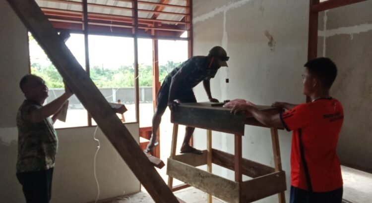 Pekerjaan pemasangan dinding dalam dan plafon Rumah Pastori menggunakan material calsiboard di Kampung Manunggal Jaya SP 4, Distrik Makimi, dilakukan dengan penuh kebersamaan antara personel TNI dan masyarakat setempat. Di sinilah wajah asli TMMD terlihat – bukan hanya sekadar pembangunan fisik, tetapi membangun ikatan sosial dan kepedulian kolektif.