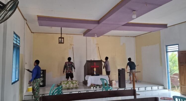 Kotawaringin Timur – Kepedulian terhadap fasilitas ibadah masyarakat kembali ditunjukkan Satgas TMMD ke-127 dari Kodim 1015/Sampit dengan melaksanakan pengecatan dinding Gereja Pelita Kasih di Desa Tri Buana, Rabu (18/02/2026).