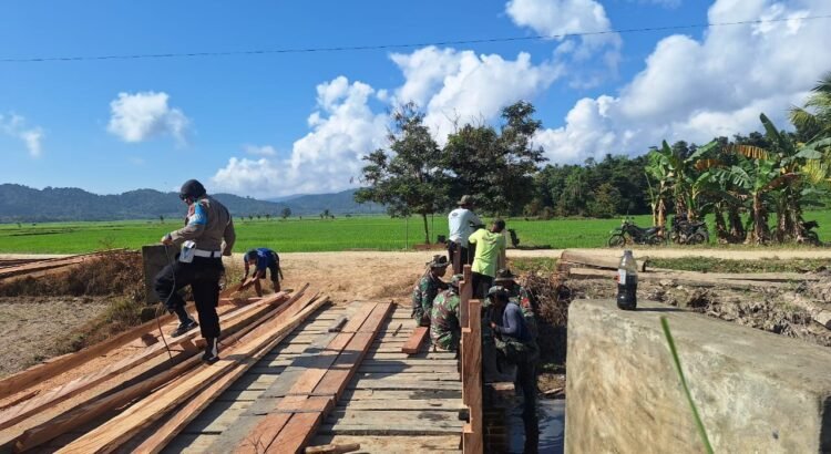 Personel TNI bersama anggota Polri dan masyarakat bahu membahu membangun infrastruktur desa, termasuk pembangunan jembatan yang menjadi akses penting bagi warga sekitar. Kegiatan ini menjadi bukti nyata soliditas aparat keamanan dengan masyarakat dalam mempercepat pembangunan di wilayah pedesaan.