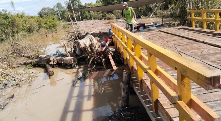 Personel Satgas TMMD ke-124 Kodim 1012/Buntok bekerja sama dengan warga terus mempercepat penyelesaian tahap akhir agar jembatan bisa segera digunakan masyarakat.