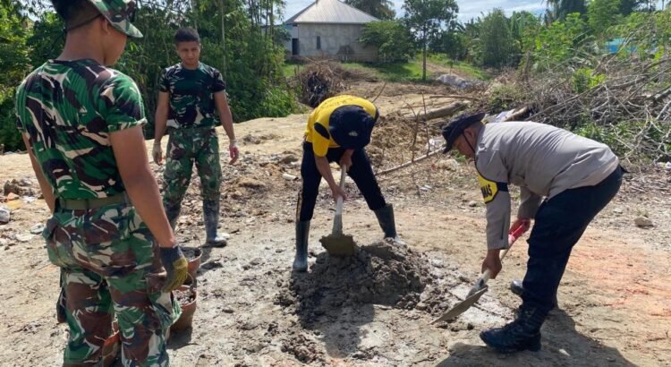 Di lokasi pekerjaan, personel dari kedua institusi tampak berbaur tanpa sekat, mengangkat dan menyusun material secara bersama-sama. Aksi tersebut menunjukkan bahwa soliditas aparat bukan hanya simbol, melainkan diwujudkan melalui kerja nyata di lapangan.