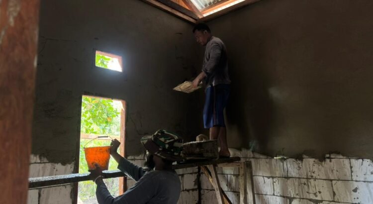 Pekerjaan pemasangan plester dilakukan sebagai tahap lanjutan pembangunan rumah agar bangunan menjadi lebih kokoh dan layak huni. Personel Satgas bersama masyarakat bekerja secara bertahap dengan penuh ketelitian.