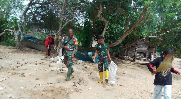 Kaimana – Dalam rangka mendukung kebersihan lingkungan, Satgas TMMD 127 Kodim 1804/Kaimana bersama anggota TNI AL menggelar kegiatan gotong royong pembersihan pantai di Kampung Sisir pada 28/02/2026.